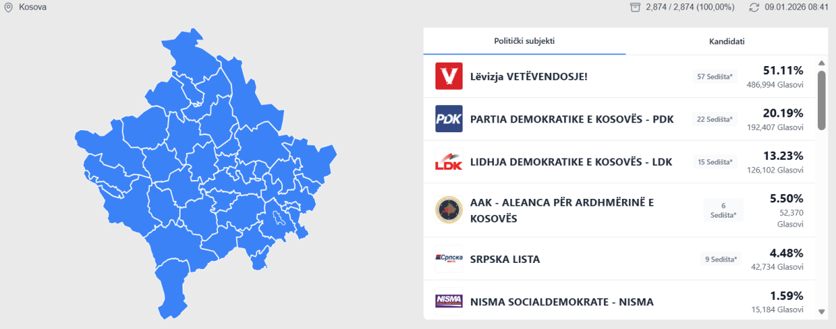 Tako će Samoopredeljenje zauzeti 57 poslaničkih mesta u Skupštini. Za formiranje vlade dovoljna je koalicija sa strankama iz nevećinskih zajednica kako bi obezbedili neophodnu većinu od 61 poslanika.