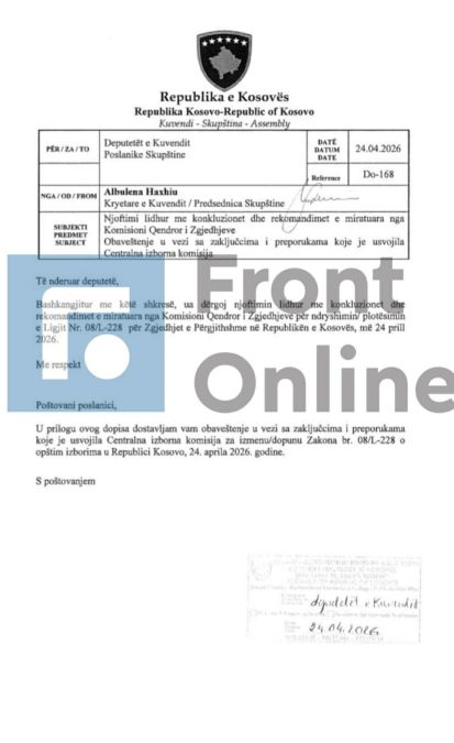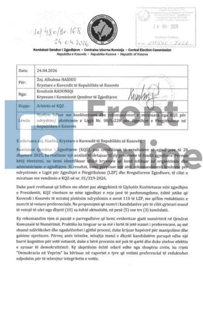 U dokumentu od 24. aprila 2026. godine, koji je predsedavajući CIK-a, Krešnik Radonjići, uputio predsednici Skupštine, Aljbuleni Hadžiju, navodi se da su nakon analize poslednjih izbora identifikovani problemi u organizaciji i sprovođenju izbornog procesa.