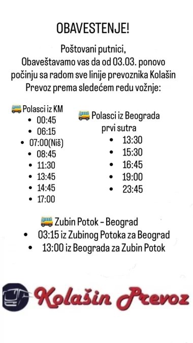 Kako se navodi u objavi na Instagramu, redovne autobuske linije saobraćaće iz Kosovske Mitrovice i Zubinog Potoka, ka centralnoj Srbiji, Beogradu i Nišu, prema ranije utvrđenom redu vožnje.