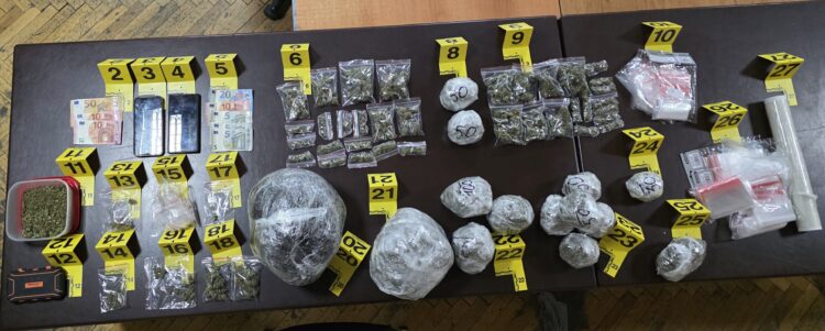 Tokom pretresa i na licu mesta pronađeno je i zaplenjeno: oko dva kilograma i 358 grama marihuane, upakovane u doze za dalju prodaju, najlonske kese i rolna folije za pakovanje narkotika, jedna elektronska vaga, novac u iznosu od 115 evra, dva mobilna telefona i jedno vozilo sa lokalnim registarskim tablicama.
