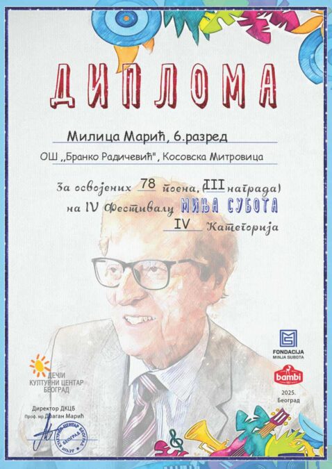 Milica Marić, učenica šestog razreda Osnovne škole „Branko Radičević“ iz Kosovske Mitrovice, osvojila je treće mesto na ovogodišnjem, četvrtom po redu Festivalu dečje pesme „Minja Subota“, koji se tradicionalno održava u novembru u Dečjem kulturnom centru Beograda.