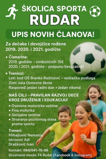 FK Rudar ističe da je njihova školica sporta mesto gde drugarstvo i igra pobeđuju, a roditelji su pozvani da na vreme rezervišu mesto za svoje mališane.