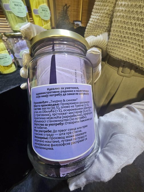 Posetioci su na njihovom štandu mogli da kupe, po promotivnoj ceni od četiri evra, teglu „Mitrovičke magle“. Proizvođač „Tmurno i sinovi“, za sada je, kako stoji u deklaraciji, privremeno raseljen, očito čekajući teritoriju gde će moći nesmetano da prodaje maglu.