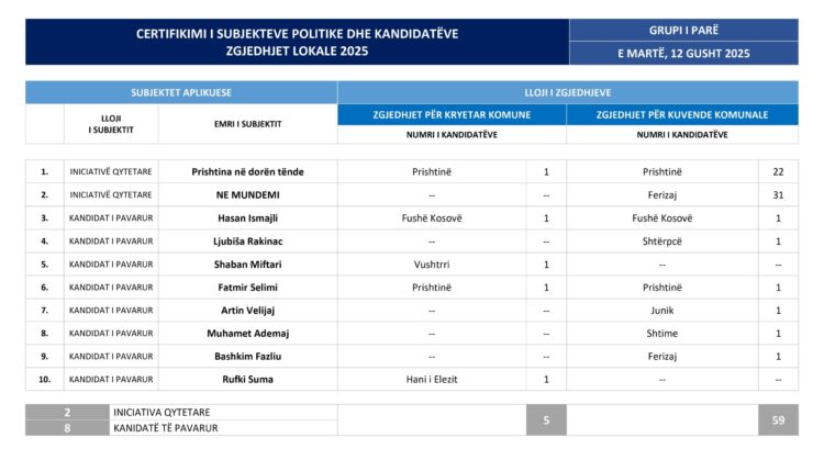 Kako je saopšteno nakon 47. sednice CIK-a, kojom je predsedavao Krešnik Radonici, među potvrđenima su dve građanske inicijative i osam nezavisnih kandidata. Oni će ukupno imati 64 kandidata – pet za gradonačelnike i 59 za odbornike u skupštinama opština.