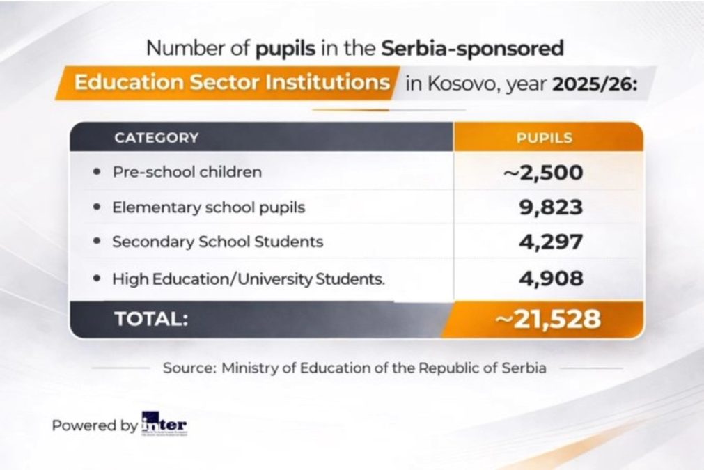 Prema podacima dobijenim od srpskog Ministarstva prosvete, školski sistem na Kosovu – u srpskom sistemu, obuhvata 21.528 dece i studenata.