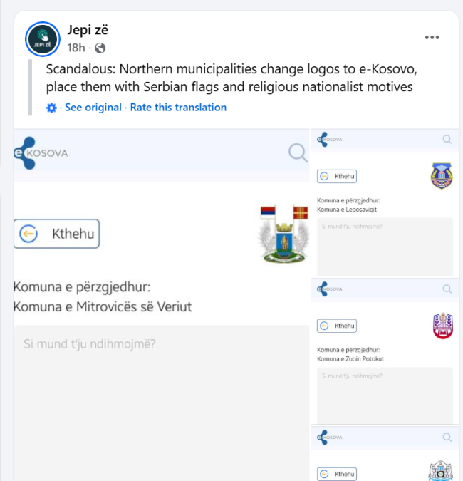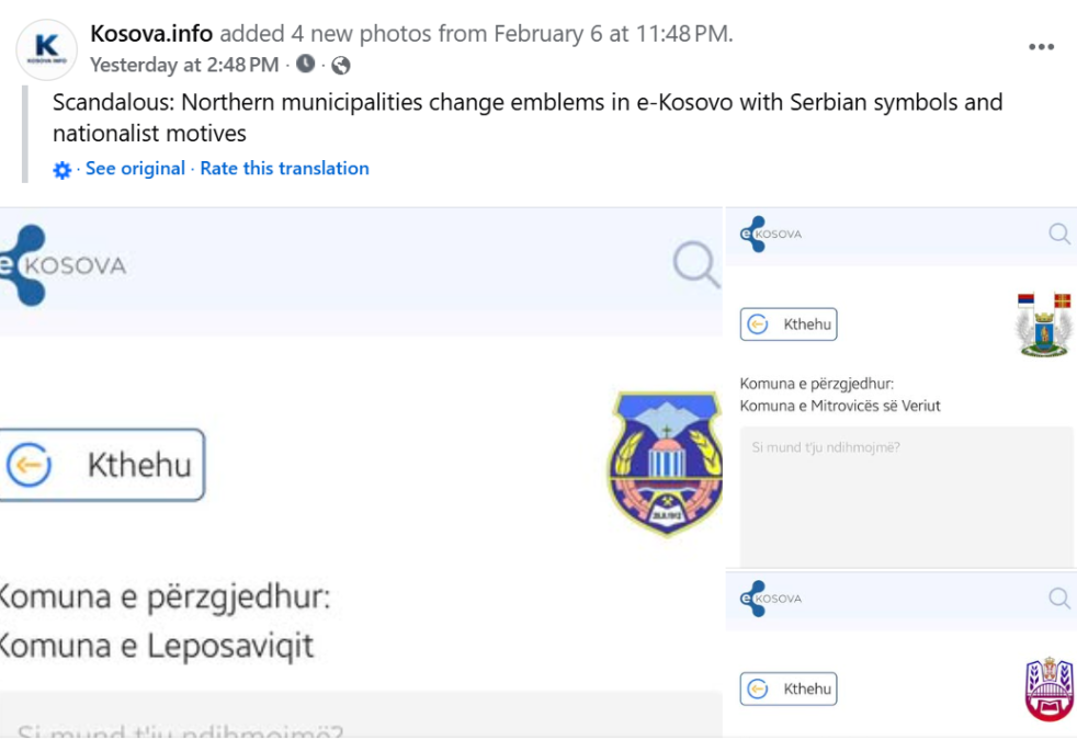 Nakon što su pojedine medijske i „influenser“ stranice na albanskom juče objavile da su severne opštine na platformi e-Kosovo „skandalozno“ promenile logotipe, ubacujući srpske zastave i kako su to predstavili – versko-nacionalističke motive, oglasilo se Ministarstvo administracije lokalne samouprave negirajući vest uz naglasak da su ovi simboli već promenjeni 2025 i da će se na ovoj platformi uskoro ažurirati novi simboli koji će zameniti simbole – sporne za Albance.