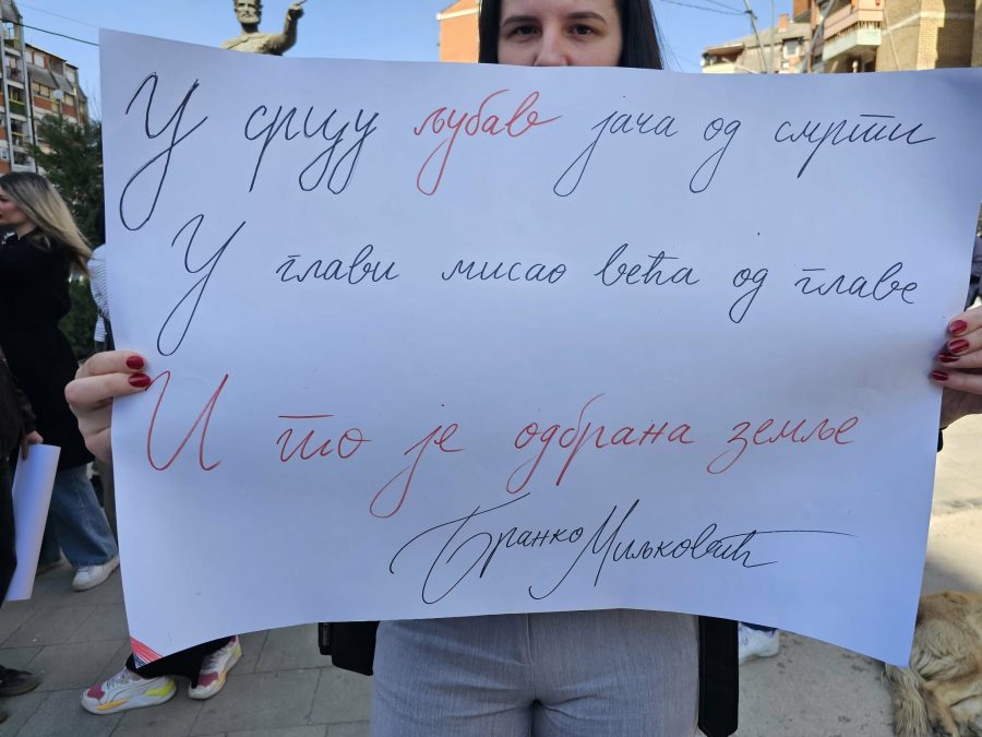 Tokom protesta, studenti su nosili transparente sa porukama: „Po kom sistemu da dišemo?“, „15. mart legalni pogrom“, „Gde će biti sledeće privremeno sedište?“, „Ne možete da nas razdavajate koliko možemo da se držimo zajedno“, „Zašto Beograd ćuti?“, „Od skora su za Prištinu Srbi na Kosovu stranci, za Beograd su odavno“. Među transparentima našao se i stih iz pesme Branka Miljkovića, „Odbrana zemlje“: „U srcu ljubav jača od smrti, u glavi misao veća od glave, i to je odbrana zemlje“.