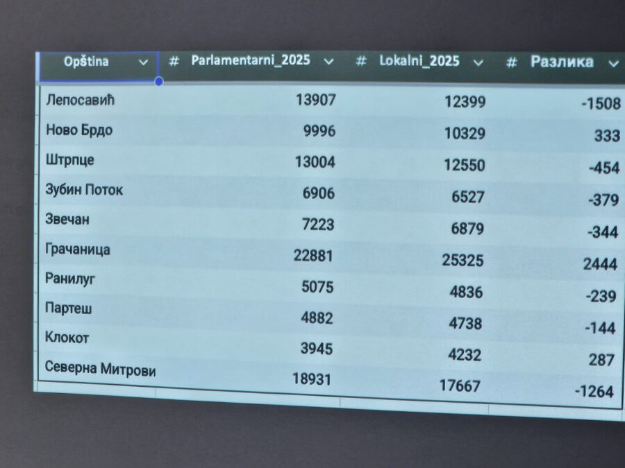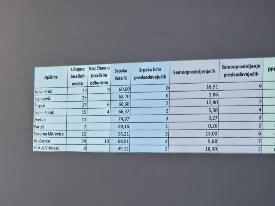 On je predstavio tabelu sa uporednim prikazom broja glasača u deset opština sa srpskom većinom za parlamentarne i lokalne izbore gde se vidi drastičan pad broja glasača u opštini Leposavić – 1.508 glasača manje, Severnoj Mitrovici – 1.264 glasača manje, a sa druge strane, u Gračanici beleži se drastično povećanje broja glasača za više od deset odsto – 2.444 lica više u biračkom spisku.