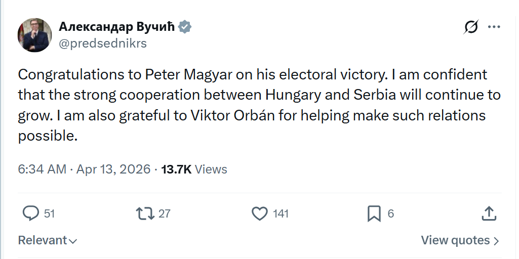 Vučić je u svojoj objavi na društvenoj mreži X, izrazio uverenje da će se nastaviti dobra saradnja između Mađarske i Srbije, zahvalivši Viktoru Orbanu na dosadašnjim odnosima dve zemlje.