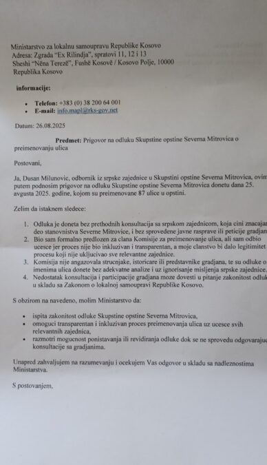Dodaju da je njihov odbornik u Skupštini opštine Severna Mitrovica, Dušan Milunović, uložio žalbu Ministarstvu za lokalnu samoupravu sa zahtevom da se ovakva odluka poništi.