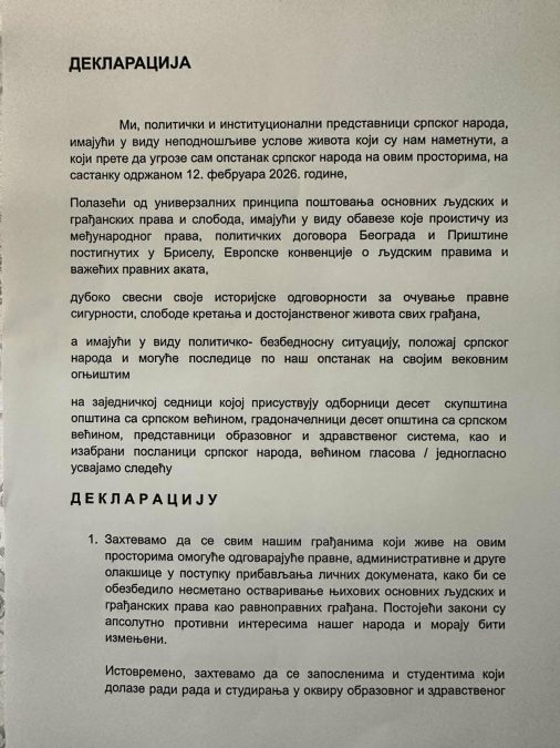 Mi, političari i institucionalni predstavnici srpskog naroda, imajući u vidu nepodnošljive uslove života koji su nam nametnuti, a koji prete da ugroze sam opstanak srpskog naroda na ovim prostorima, na sastanku održanom 12. februara 2026. ggodine.