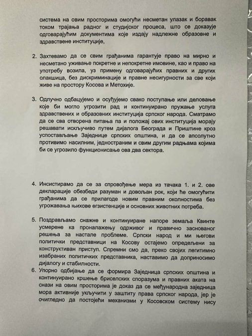 3. Odlučno odbacujemo i osuđujemo svako postupanje ili delovanje koje bi moglo ugroziti rad i kontinuirano pružanje usluga zdravstvenih i obrazovnih institucija srpskog naroda. Smatramo da se sva otvorena pitanja pa i položaj ovih insitucija moraju rešavati isključivo putem dijaloga Beograda i Prištine kroz uspostavljanje Zajednice srpskih opština, i da se apsolutno protivimo nasilnim, jednostranim i svim drugim radnjama kojima bi se ugrozilo funkcionisanje ova dva sektora.