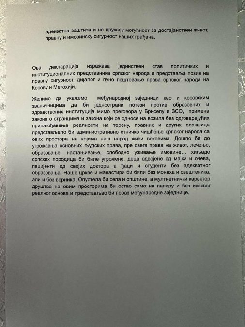 Ova deklaracija izražava jedinstven stav političkih i institucionalnih predstavnika srpskog naroda i predstavlja poziv na pravnu sigurnost, dijalog i puno poštovanje prava srpskog naroda na Kosovu i Metohiji.